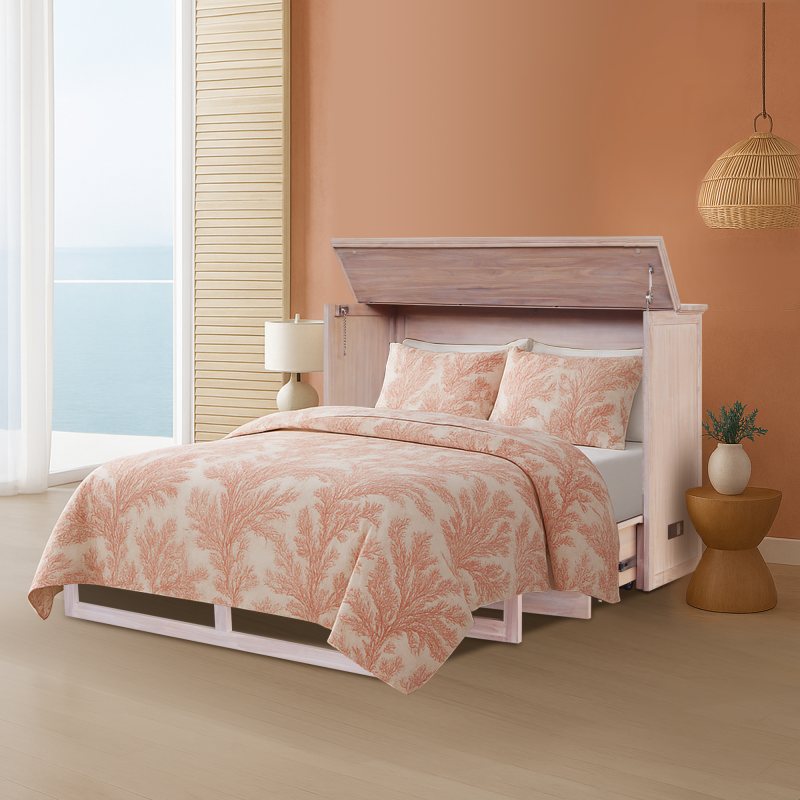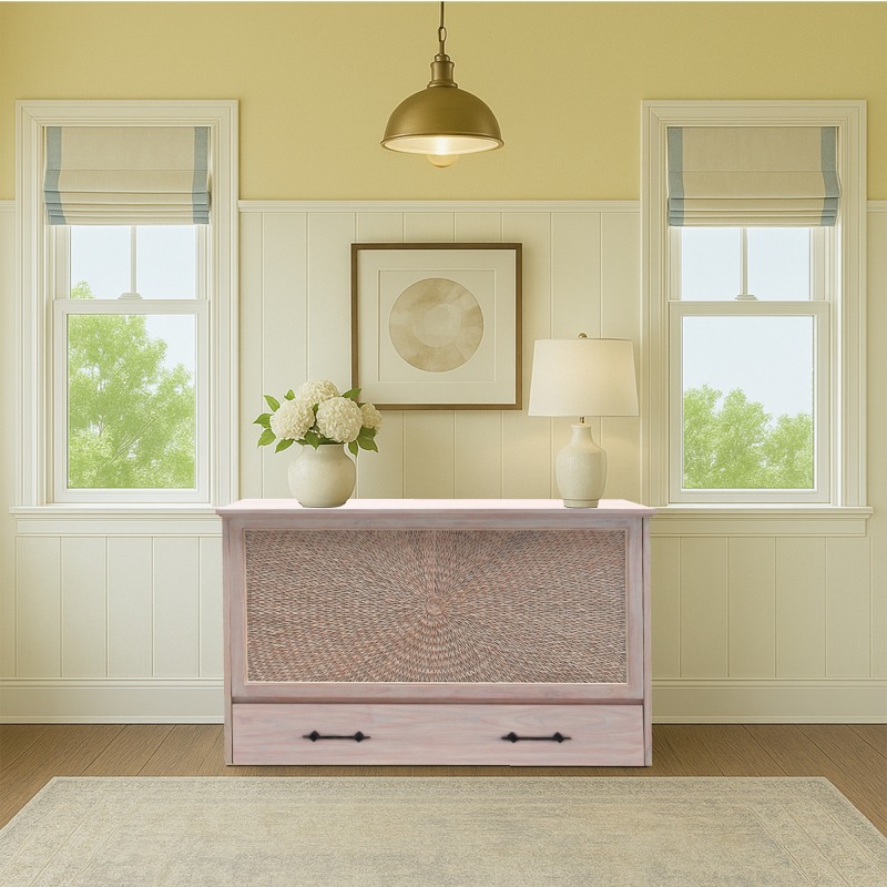 Key Largo Queen Size Wooden Cabinet Bed in French White Finish with Abaca Decor, USB Port, Drawer, and 6-Inch Tri-fold Memory Foam Mattress