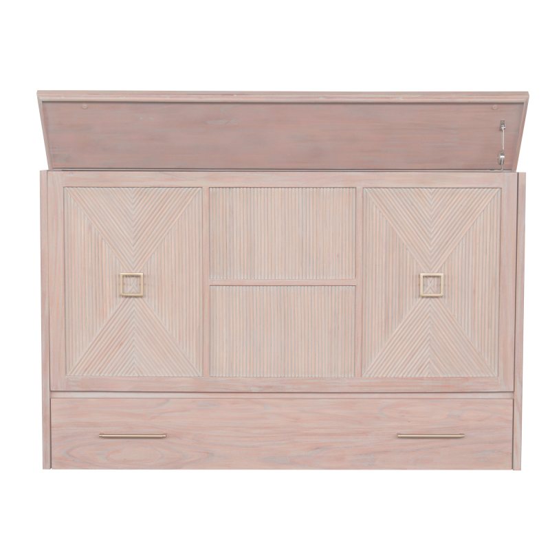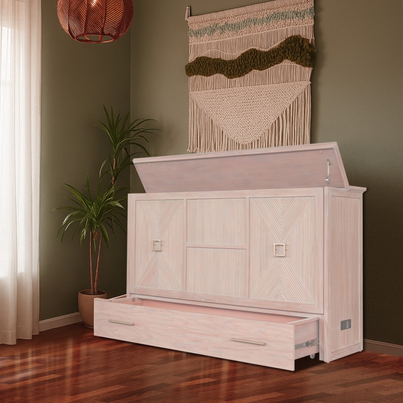 Universal Queen Size Wooden Cabinet Bed in French White Finish with Rattan Decor, USB Port, Drawer, and 6-Inch Tri-fold Memory Foam Mattress